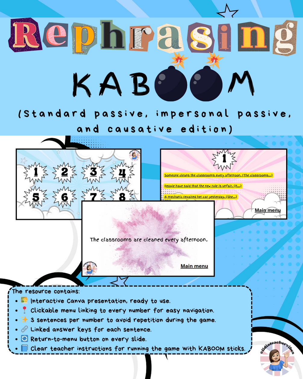 Tired of boring grammar drills? Transform your classroom with Rephrasing KABOOM, the interactive game that makes standard passive, impersonal passive, and causative fun, engaging, and easy to master!