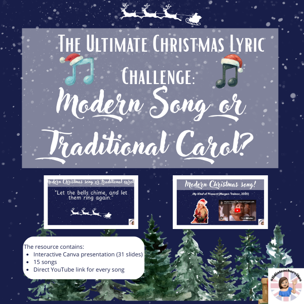 Bring the festive spirit straight into your classroom with this fun, ready-to-use Christmas lyric guessing game! Your students will LOVE trying to figure out whether each lyric comes from a modern Christmas hit or a traditional carol. Perfect for the last weeks of term, holiday lessons, warm-ups, or Christmas parties! 🎅✨